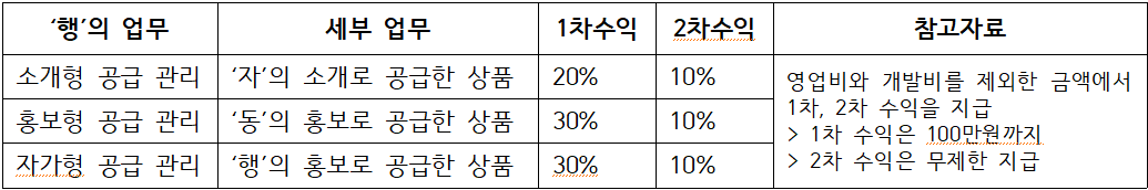 2. 1차 수익이 총 100만원을 넘어서면 그때부터는 2차수익 비율로 지급하되, ’그룹‘ 소속인 온리원연구소의 사업자로 ’행‘에게 지급한다.